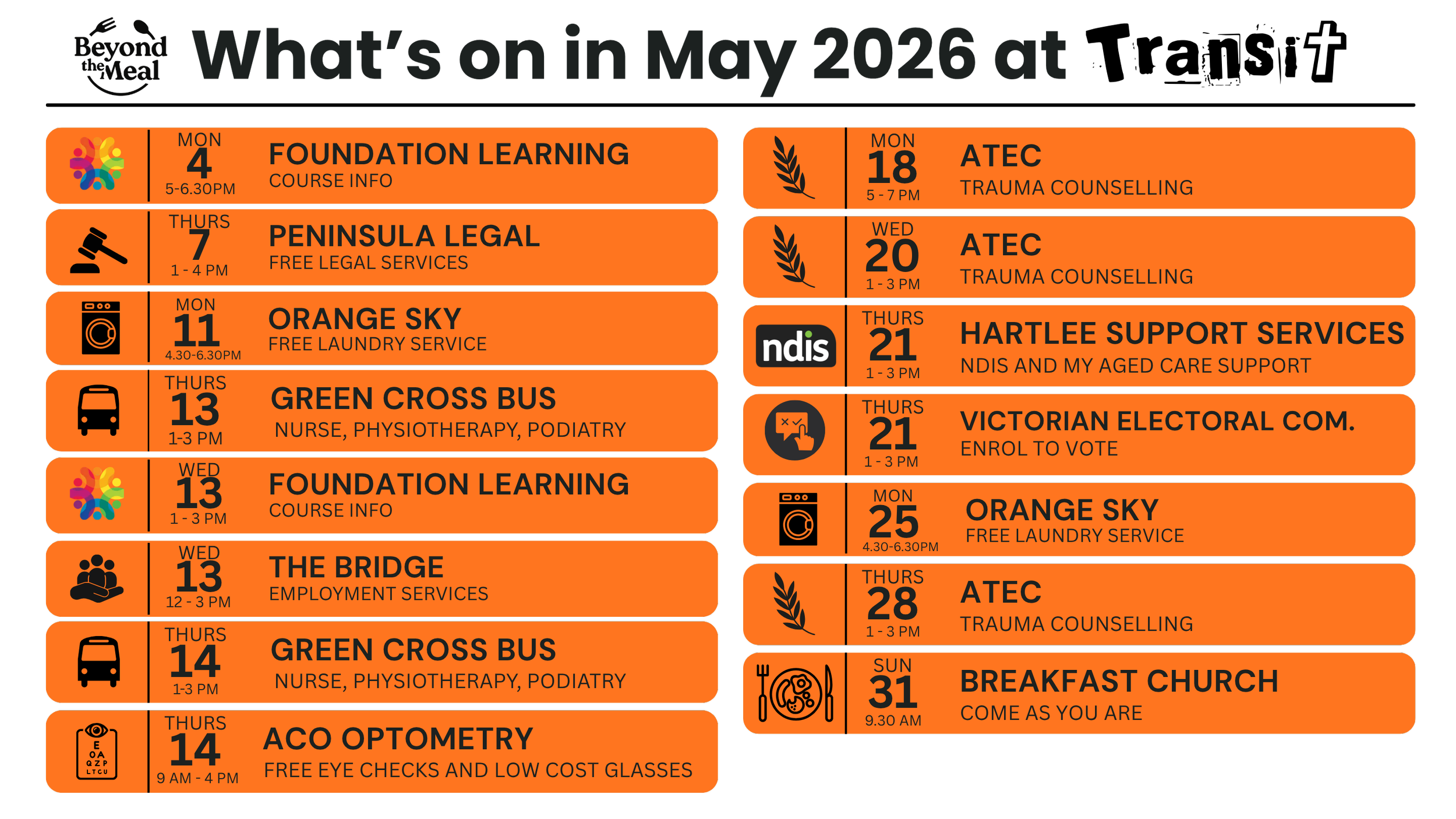 Alongside the meal, you can connect with onsite support services and people who are here to walk with you through whatever you’re facing - whether it’s a short‑term struggle or a bigger season of challenge.