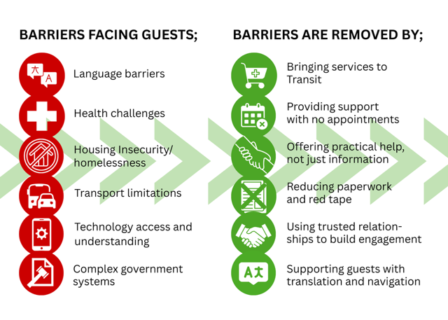 Beyond the Meal supports guests beyond food relief. While many first come to Transit for food, they are often facing complex barriers. By bringing practical support on site and removing many of the usual obstacles, we help guests connect with the services they need to move forward.